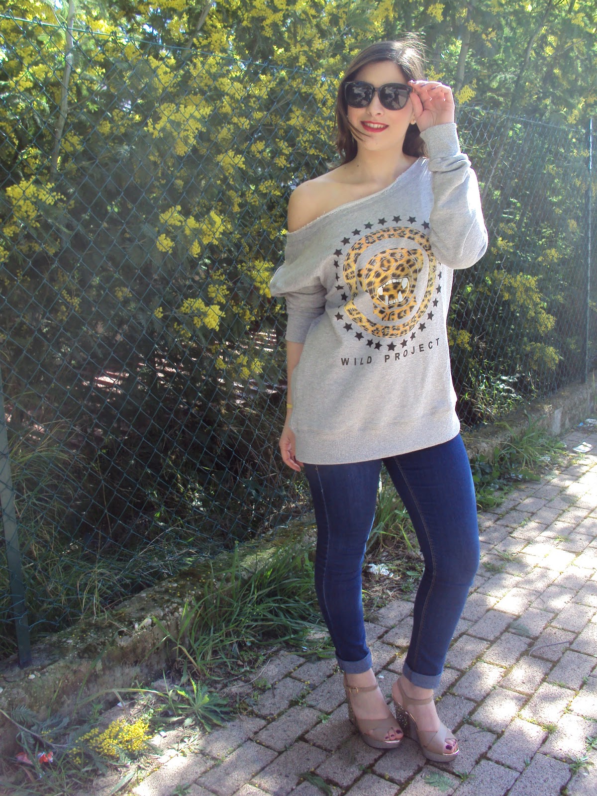 Per oggi ho scelto un look easy,quasi sporty chic.Ho indossato una maxi felpa di Dress Code con una bella tigre stampata al centro,simbolo del mio caratterino alle volte per niente pacifico,ma forte abbastanza da superare anche le battaglie più difficili.Per dare un tocco chic ho scelto queste zeppe firmate Menbur,super luminose e brillanti piene di paillettes sui toni del beige e dell' oro.Ultimo tocco il bracciale Imisi (Clicca QUI per il mito dei braccialetti) con una scritta che trovo ad hoc per oggi e per il futuro.